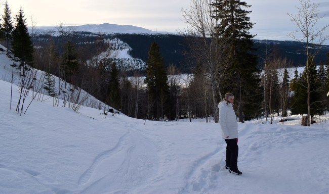 Dagen efter den stormiga dagen blev både lugn och skön. Tyvärr fortsatte inte min rygg att må lika bra som i början av veckan i Åre och den här dagen hade jag rejält ont i ländryggen. Men jag hängde ändå med på en promenad eftersom det kändes otroligt trist att stanna kvar inne när de andra gick iväg. Min son drabbades av plötslig inspiration när han såg alla snöklumpar längs vägen vi gick på och resultatet blev det här. Inte en snögubbe men kanske ett snöklumpstorn. Det stod kvar när vi fortsatte vår promenad så kanske frös det fast ordentligt sedan.