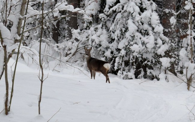 I dag blev det en promenad lite senare än vanligt. Det ser ut som en kvällspromenad men jag gick ut prick kl 15.00. Då hade solen gått ner för ca 40 minuter sedan och det började mörkna. På en gångväg hade det kommit upp en ny skylt. Jag misstänker att det är en snyggt gjord privat variant för inte brukar väl sådana skyltar sättas upp på gångvägar. Men jag har hört eller läst om att det finns många älgar på Frösön nu så kanske är varningen befogad. Förra hösten och början av vintern såg jag ganska många älgar och lyckades föreviga dem på bild några gånger men i år har jag inte sett till några. Men efter att ha sett skylten såg jag mig omkring lite mer noga och tog upp kameran från väskan. Det vore ju synd att missa ett bra tillfälle. Någon älg såg jag inte men jag skymtade ett antal rådjur inne i skogen.