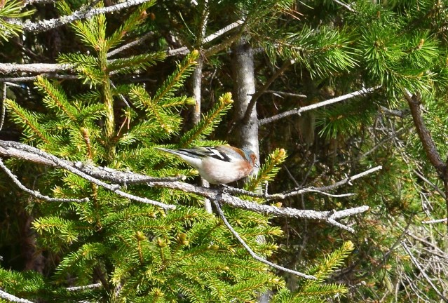 Bofinkar och koltrastar sjöng vackert för mig och längre bort hoade en ringduva. Den sjunger inte vackert så jag kallar det lätet för hoande. Men det kan ju inte den rå för och jag blir ändå glad när jag hör den. En liten bofink satt stilla en kort stund och såg ut att äta något från en grankvist. Kanske något kryp som fick sluta sina dagar där.
