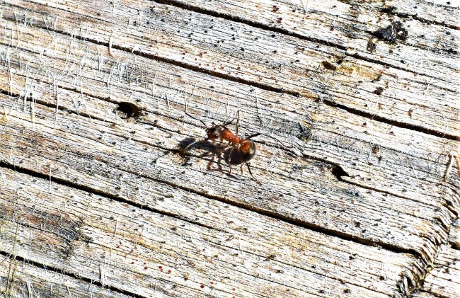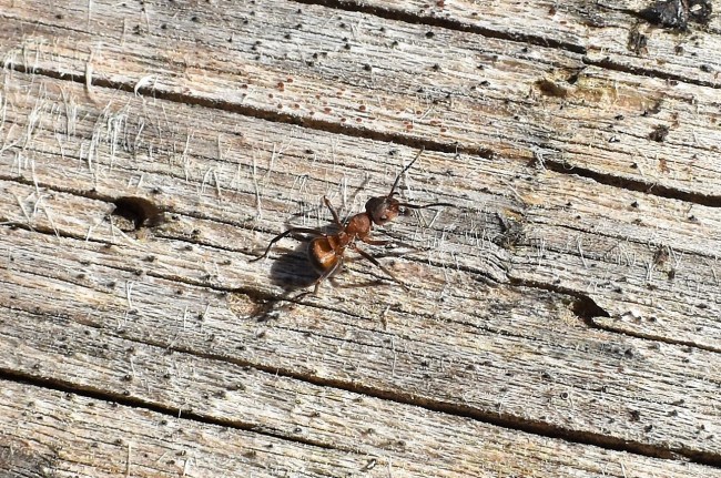 Ett annat kul möte, i alla fall ur min synvinkel, blev det när jag klev över en låga (dött träd som fallit till marken i skogen). Ett gäng myror sprang omkring på den men en av dem höll sig ganska stilla och jag satte mig ner på knä för att försöka få den på bild. Ni kan se hur den, kanske ilsket, vänder sig om för att protestera och nästan ställer sig helt upp för att jaga bort mig. Jag förstod vinken och lät den vara ifred.