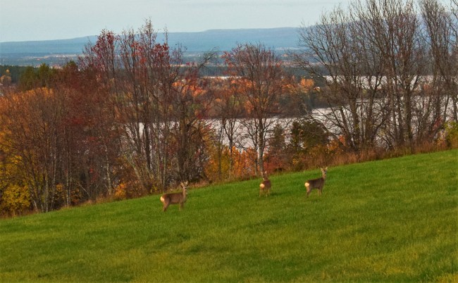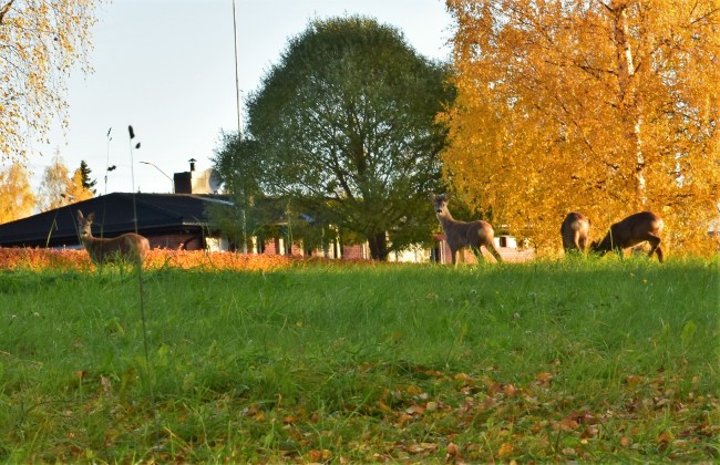 På vissa platser är det fortfarande otroligt färgrikt och löven sitter kvar på grenarna men lika många träd har blivit helt kala. Det är lite trist men det finns mycket att titta på ändå. Som den här rådjursfamiljen, som jag fick se igår. Tyvärr är vilda djur ofta ganska långt bort och inte så lätta att få tydliga på bild. Ibland har man tur men de här skuttade iväg nästan genast när de såg mig komma gående.