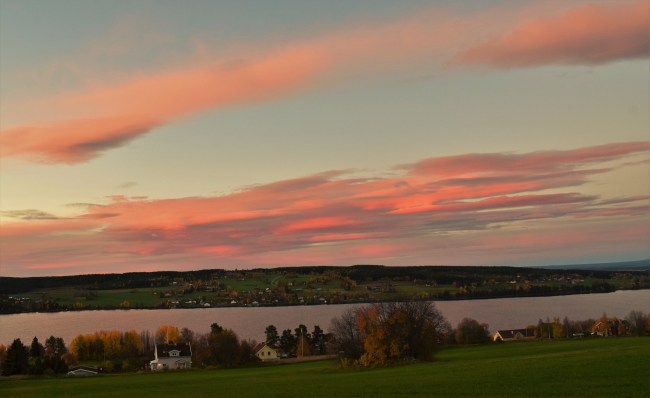 Vilken tur då att det blev ännu en morgon med rosaskimrande moln från soluppgången. Det är märkligt att man, som jag gjorde här, kan gå åt helt motsatt håll och ändå se de här färgerna på himlen.