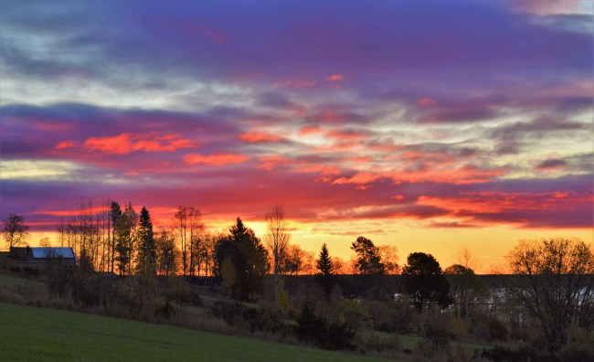 Det blåste ganska kallt men jag ville inte gå längre utan stod kvar uppe på kullen och drog upp luvan över mössan. Snart kommer solen upp över skogen där borta.