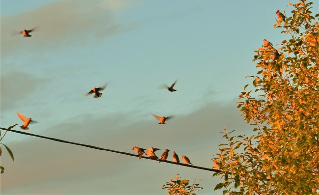 Jag såg ett gäng fåglar sitta på en ledning och jag blev glad när jag såg att det var sidensvansar. Men de var helt tysta så det blev inga silverbjällror den här gången. De är också fotade från långt håll och bilderna är kraftigt beskurna. Nästa gång jag ser dem hoppas jag komma närmare för de är så fina.