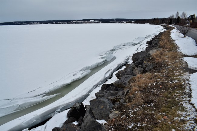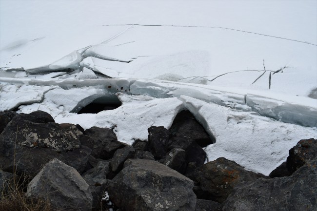 Vattennivån har börjat sjunka i Storsjön och det syns tydligt på isen. När vattnet sjunker undan blir det så här.