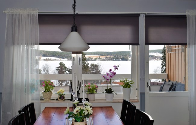 Min balkong har söderläge och jag brukar rulla ut markisen när solen skiner. Men om det blåser mycket vågar jag inte ha den ute och då blir det väldigt varmt i min lägenhet. Det är också problem när jag är bortrest på sommaren. Hittills har jag löst det genom att hänga upp lakan i köksfönsterna men nu har jag blivit inspirerad av min lillasyster och hittat en annan lösning. Hon har monterat en rullgardin i ett fönster hos sig och hon sa att det var väldigt enkelt. Jag har minnen från förr då det var ganska besvärligt att få till det men jag tänkte att om syrran klarar det så borde jag också göra det. Vi är nog ungefär på samma nivå när det gäller praktiska lösningar. Sagt och gjort. Idag fick jag hem två rullgardiner och som ni ser så lyckades jag ganska bra. Inte alls svårt faktiskt. Jag valde inte helt mörkläggande gardiner eftersom det blir trist om det blir för mörkt.