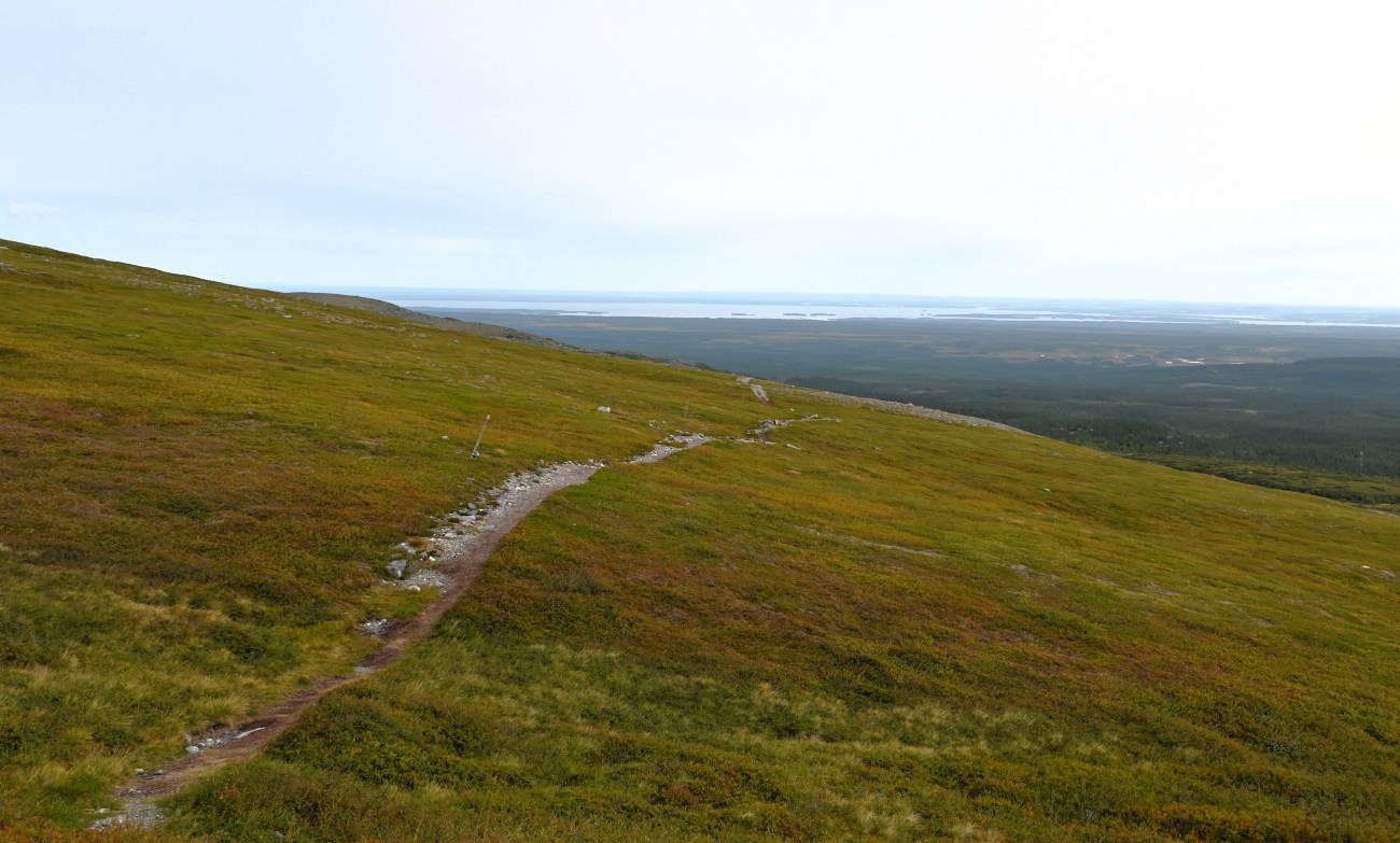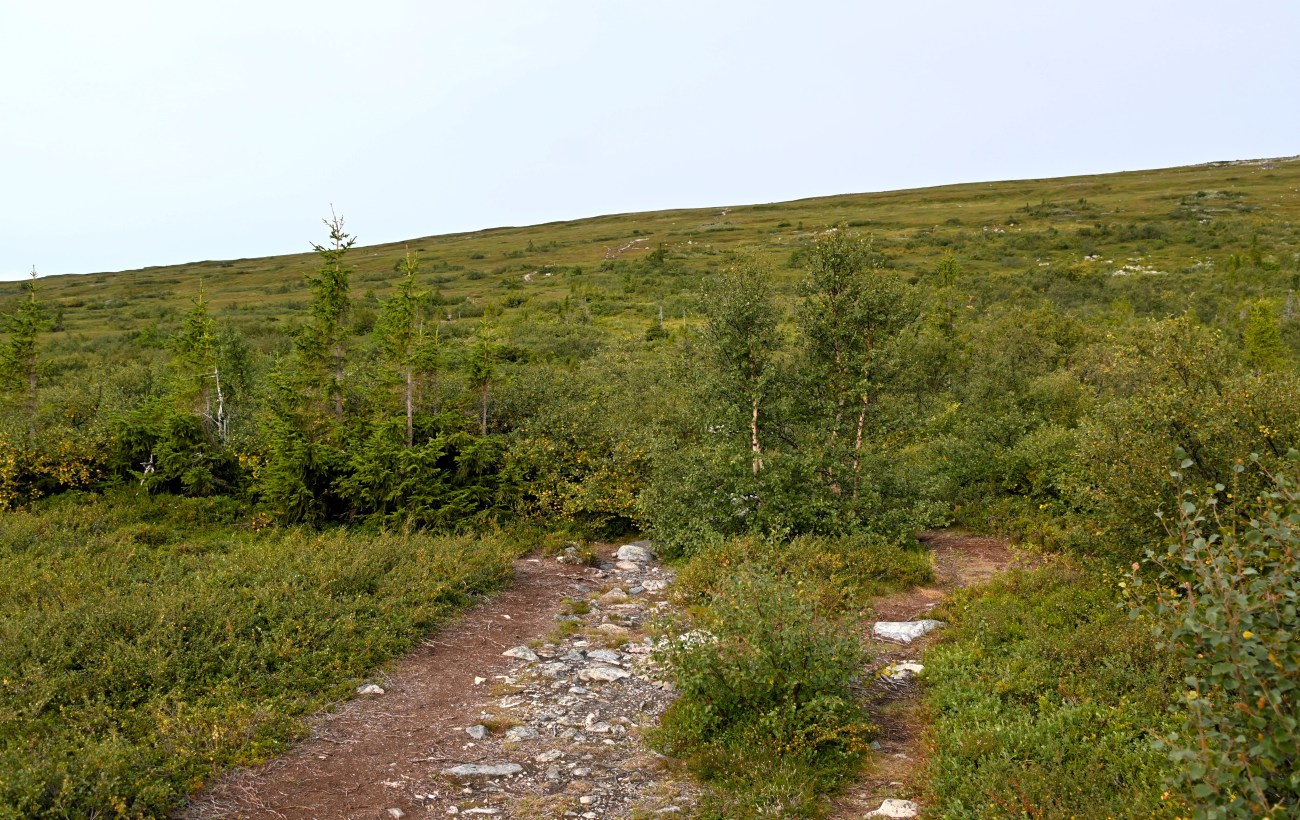 Här stod jag och tvekade lite. Om jag hade fortsatt på den här stigen skulle jag så småningom komma bort till vackrare vyer med fler fjäll att njuta av. Men det var inte den leden jag hade valt att gå på så jag bestämde mig för att återkomma när väder och diverse krämpor tillåter en längre vandring.