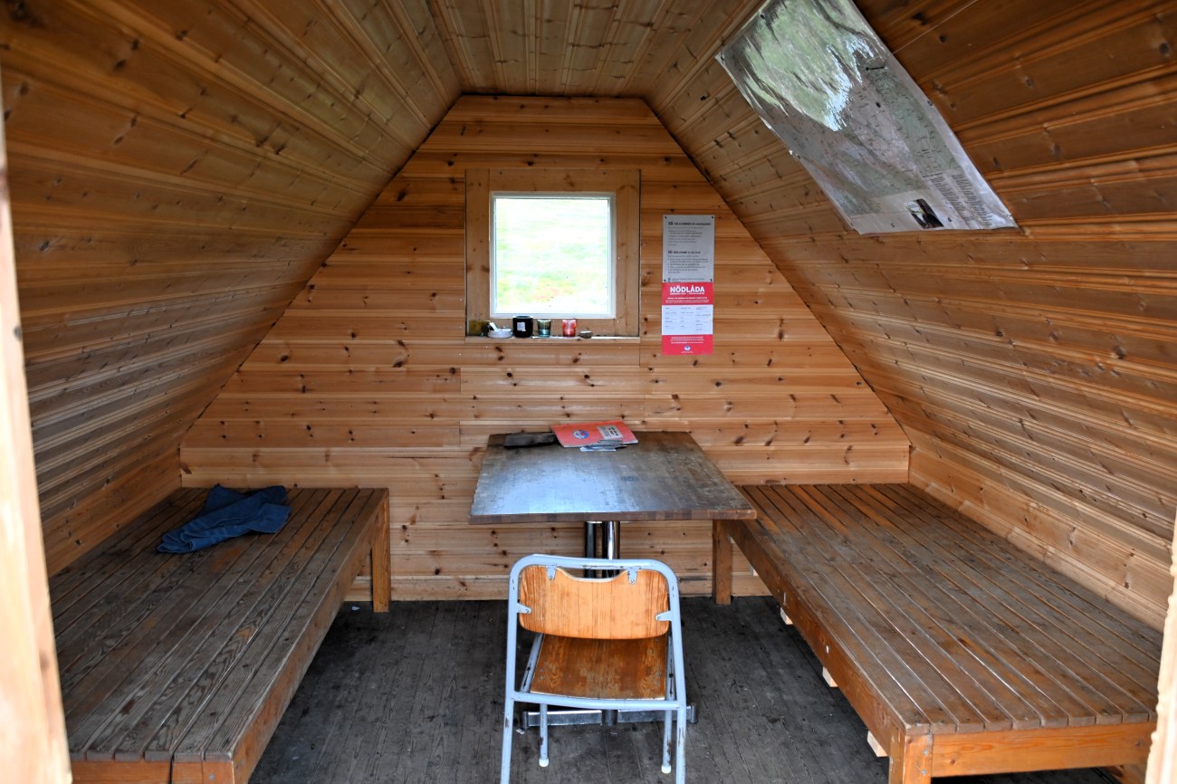 Jag gick in där och åt upp en av mina mackor. Lite trist att sitta inne men det var inte lockande att sitta ute i blåsten. Jag hade kanske kunnat hitta lä någonstans men jag valde den lätta lösningen. Här inne fanns en liten kamin med tillhörande nödved och dessutom en nödlåda. Jag såg inte efter vad som fanns i nödlådan men kanske några konserver och sjukvårdsartiklar.