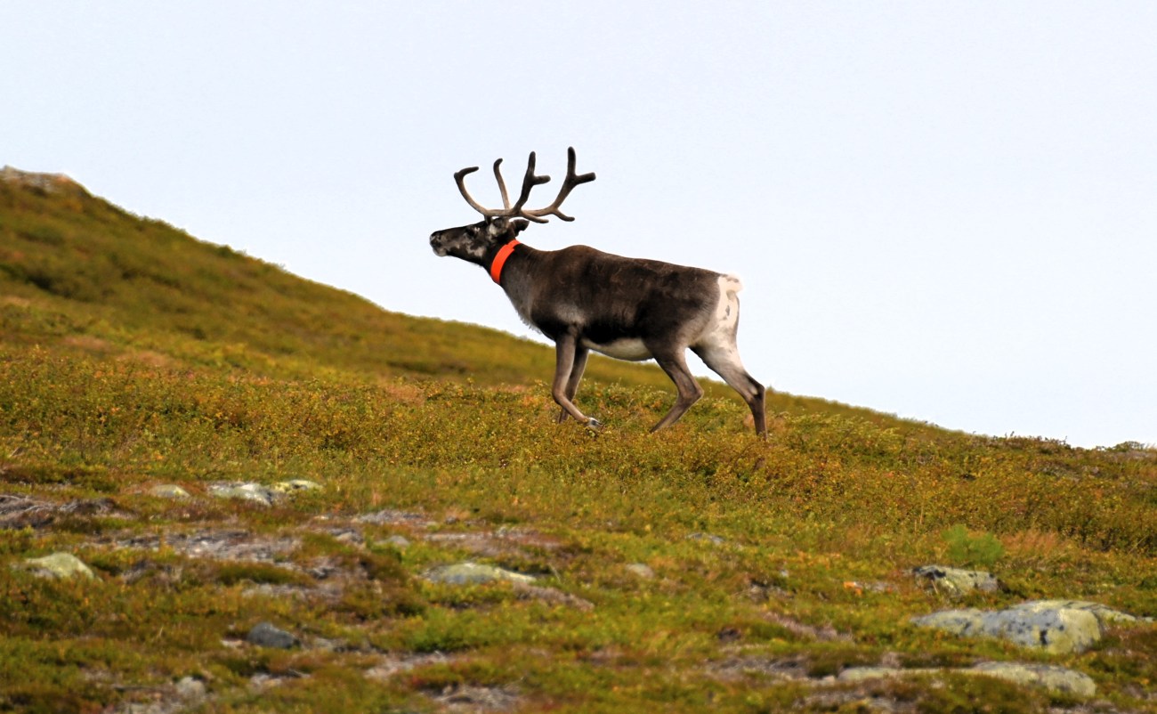 Jag tog en annan väg ner den första biten för att få se något annat. Men jag var snart tillbaka på leden igen. Jag höll mig dock en bit på sidan om den för att undvika en del myrmark och för att det var mjukare att gå på den låga vegetationen. Plötsligt kom en ren springande och den verkade ha bråttom. Jag var på ett ganska långt avstånd från den så det var nog inte jag som skrämde den.