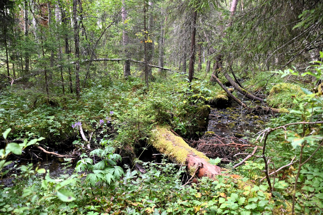 Naturen bildar broar alldeles på egen hand. Det syns inte men det krävdes ett litet skutt från slutet av stammen till andra sidan och jag såg till att landa på rätt fot. Det går inte att hålla sig enbart till fina stigar när man letar stolpar men oftast kommer man ganska nära med hjälp av stigarna.
